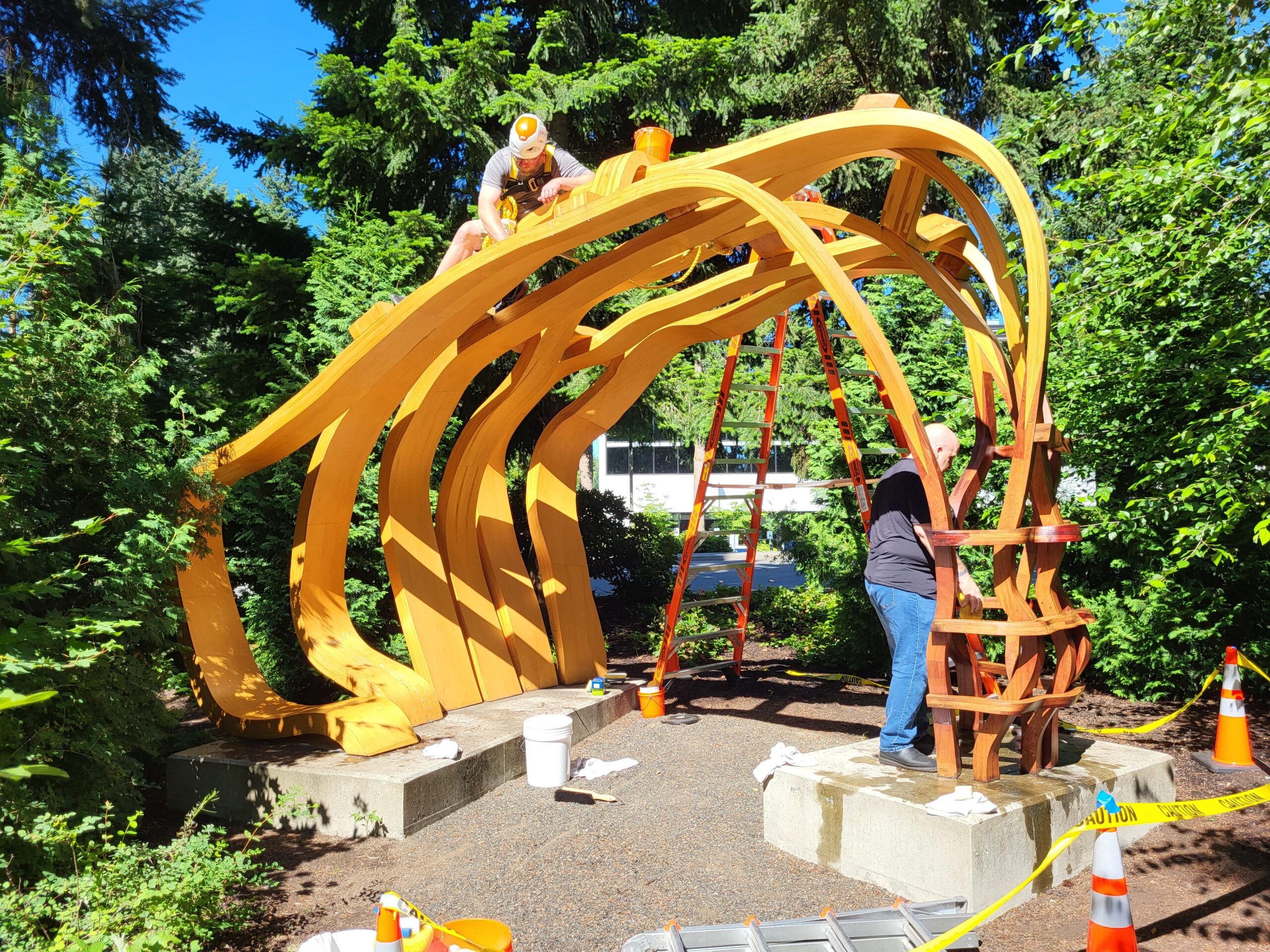The Lumiere Group coordinated with Tlingit artist Preston Singletary and sculptor David Franklin; artists commissioned by Microsoft to create a sculptural wayfinding component. Welcoming visitors to their new campus, the artwork extends from the roadway to the pedestrian area. It is executed in Singletary’s signature interpretation of Northwest formline style and consists of six ravens mounted on three vertical poles. Coordinating installation was key in one of the largest active construction sites in Western Washington.